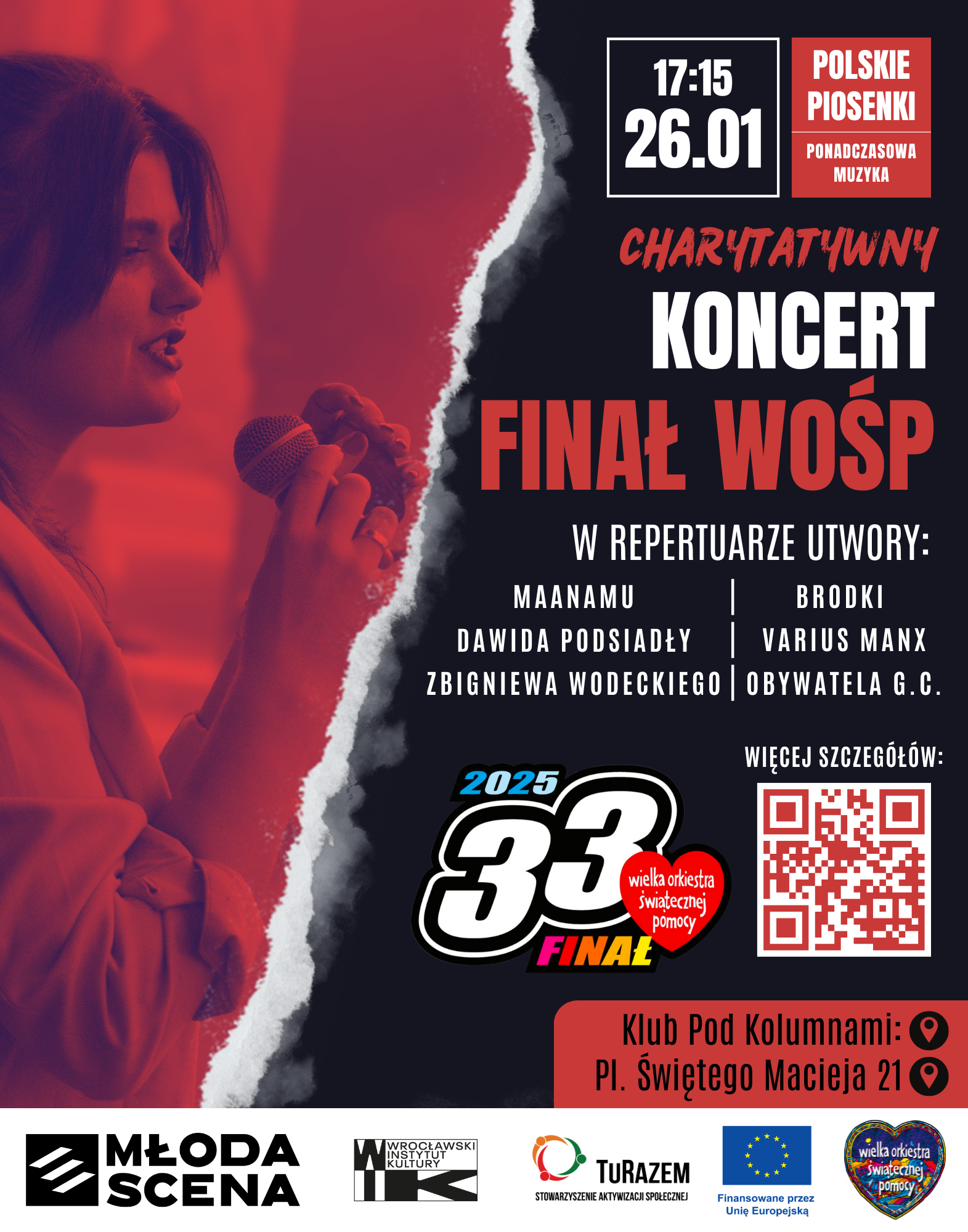 W dzisiejszych czasach młode osoby często mają ograniczony dostęp do darmowych, regularnych działań artystycznych, a jednocześnie brakuje przestrzeni, w której można bezpiecznie rozwijać talent i budować relacje w lokalnej społeczności. Dlatego powstała MŁODA SCENA – projekt solidarności młodych osób, który poprzez muzykę i wspólne działania wzmacnia integrację, współpracę i aktywne uczestnictwo młodzieży w życiu Wrocławia. Projekt realizowany był w okresie 01.09.2024–31.08.2025, głównie w przestrzeni CAL Przed·Pokój H13, a także poza miastem – m.in. w Wojnowicach.